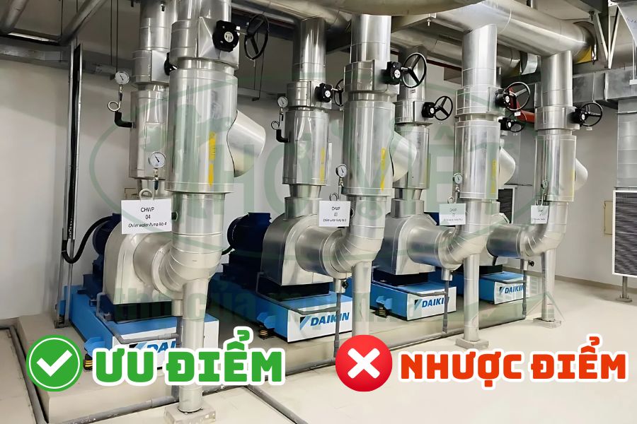 - Chi phí đầu tư ban đầu cao, bao gồm cả phòng máy, bơm và tháp giải nhiệt.